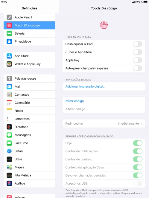É possível definir o tablet para utilizar a sua impressão digital como código de bloqueio ou para autenticar as suas compras no iTunes e na App Store. Antes de ser possível utilizar o Touch ID, é necessário ativar o código de bloqueio.
