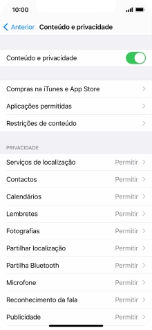 Prima o indicador junto de "Conteúdo e privacidade" e siga as indicações no ecrã para escolher as definições para conteúdo e privacidade.