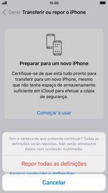 Prima Repor todas as definições. Aguarde um momento enquanto o telefone restabelece as definições originais. Siga as indicações no ecrã para configurar o telefone de modo que este fique pronto a ser utilizado.