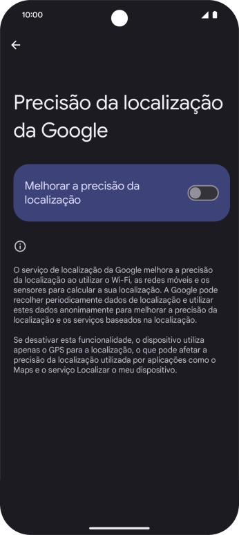 Se premir o indicador junto a "Melhorar a precisão da localização" para desativar a função, o telefone irá encontrar a sua localização precisa utilizando os satélites GPS, mas poderá levar mais tempo uma vez que não terá acesso a informações suplementares da rede móvel ou das redes Wi-Fi nas proximidades.