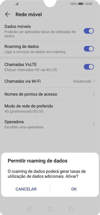 Prima o indicador junto a "Roaming de dados" para ativar ou desativar a função.