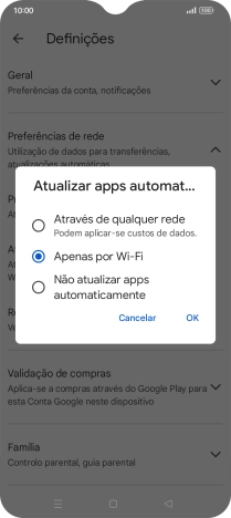 Para ativar a atualização automática de apps via Wi-Fi, prima Apenas por Wi-Fi.