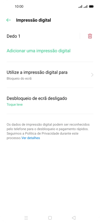 Prima Impressão digital e introduza o código adicional de bloqueio do telefone que criou anteriormente.