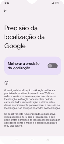 Se premir o indicador junto a "Melhorar a precisão da localização" para desativar a função, o telefone irá encontrar a sua localização precisa utilizando os satélites GPS, mas poderá levar mais tempo uma vez que não terá acesso a informações suplementares da rede móvel ou das redes Wi-Fi nas proximidades.