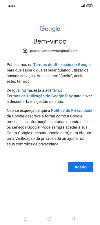 Prima Aceito e siga as indicações no ecrã para escolher as definições da conta Google.