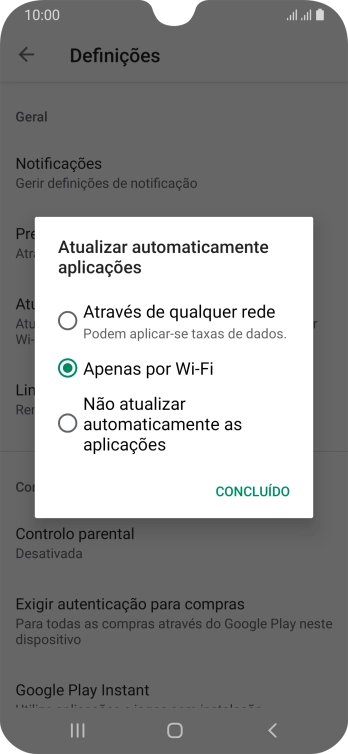 Para ativar a atualização automática de apps via Wi-Fi, prima Apenas por Wi-Fi.