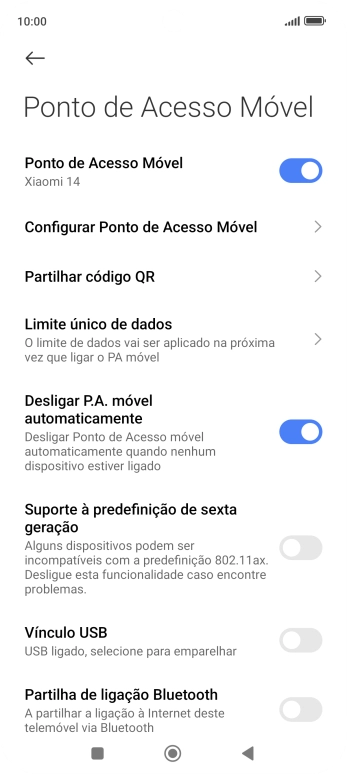 Prima o indicador junto a "Ponto de Acesso Móvel" para ativar a função.