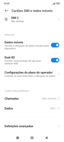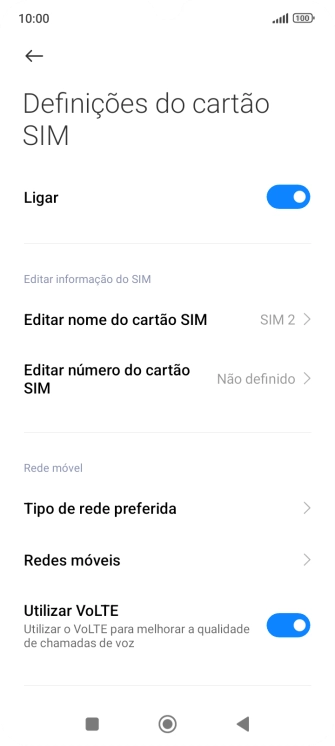 Prima o indicador junto a "Ligar" para ativar ou desativar a utilização do cartão SIM.